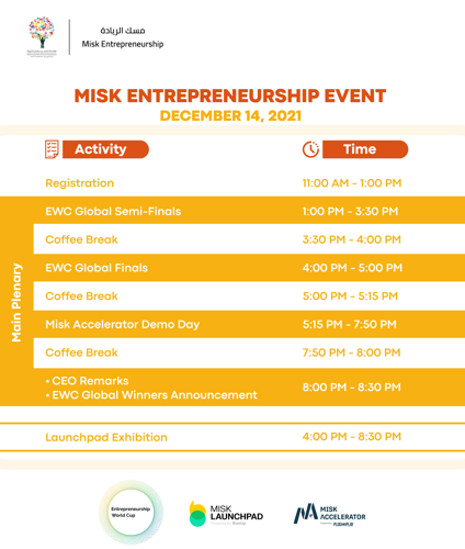 احتفال نهاية العام لمسك الريادة في مؤسسة مسك هو فعالية ليوم كامل تتكون من ثلاثة أقسام رئيسية: نهائيات كأس العالم لريادة الأعمال، ومعرض مسك الانطلاق للشركات الناشئة في مرحلة الأفكار، ويوم عرض شركات مُسرّعة مسك، كل ذلك في ليلة واحدة تجمع بين ألمع رواد الأعمال من جميع أنحاء العالم.