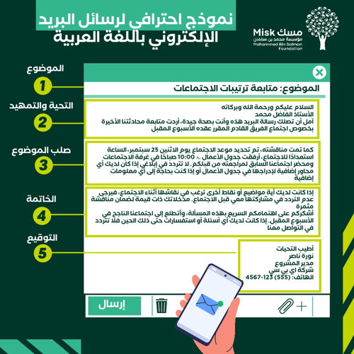 الحفاظ على نبرة احترافية من التحية إلى الخاتمة واستخدام الكلمات الرسمية عند مخاطبة المستلم أمر ضروري جداً لضمان تجاوب المستلم مع رسالتك، والرد عليها بنفس هذا المستوى من الاحترافية المتوقعة.
