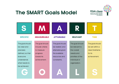من المهم مراجعة الأهداف الشخصية أو حتى المهنية باستمرار والتحقق من واقعيتها وقابليتها للتنفيذ، قد يكون من الضروري أحيانًا إعادة تقييم أهدافك وتعديل جزء منها حسب ما تراه مناسب. تأكد من أن أهدافك واقعية وقابلة للتحقيق ويمكن أن تستخدم نموذج SMART GOALS لبناء أهداف بشكل منهجي ومنظم فهذا النموذج سيساعدك علي وضع أهدافًا محددة وواضحة وقابلة للقياس مما يسهل عليك مراجعتها باستمرار وتحسينها بشكل دوري.