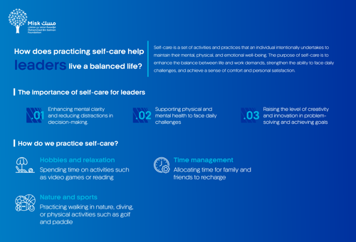 In a world filled with rapid changes and unexpected challenges, most leaders and entrepreneurs often face daily pressures that require them to make critical decisions or deal with unforeseen obstacles and adapt to continuous market fluctuations. With the abundance of these challenges and changes, practicing self-care becomes not just a luxury or leisure activity, but a necessity for building a balanced and effective leader capable of maintaining focus, managing emotions, and acting with wisdom and intelligence in various situations.